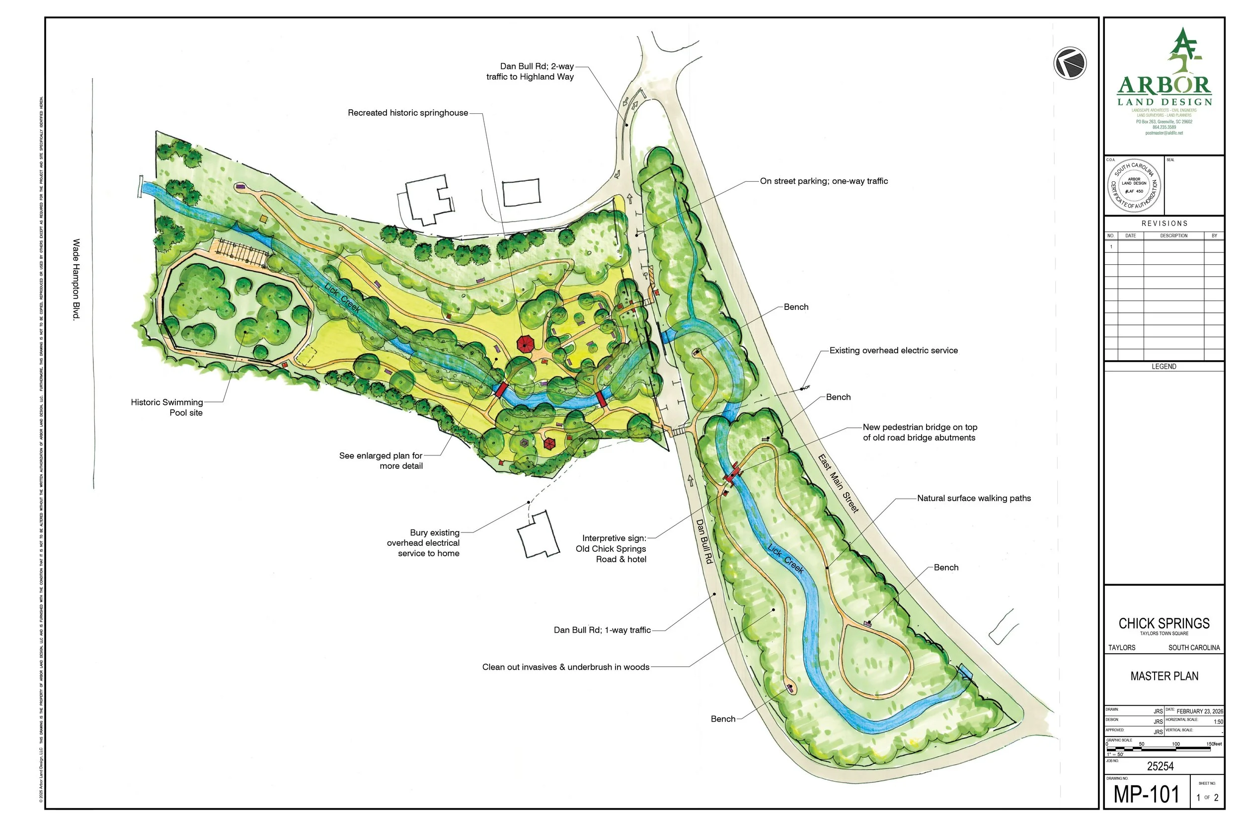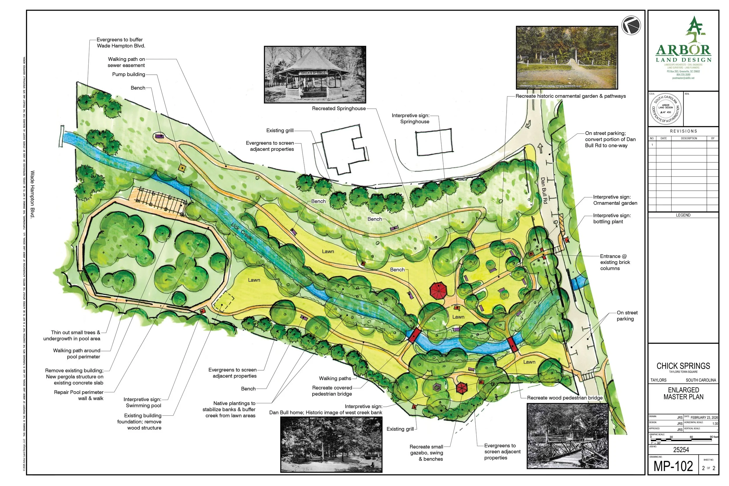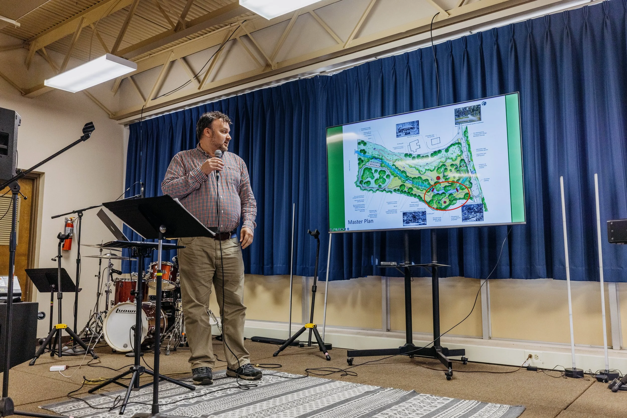 Jason Smit of Arbor Land Design presented the master plan. Using side-by-side comparisons of historic photographs and current site conditions, he showed how the design draws directly from what was there before: recreated ornamental gardens near the spring house, restored footbridges where the original stone abutments still stand, natural walking trails, and interpretive signage throughout. The plan is organized into four phases, starting with the spring house and public access.